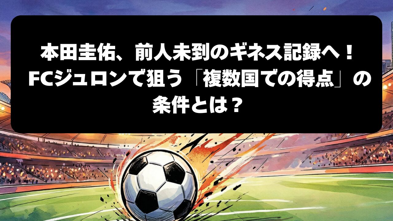 免責事項:本記事に記載されたギネス世界記録に関する情報は、過去の報道および一般的な認定基準に基づく推測を含んでいます。正式な認定条件や現在の記録保持状況については、ギネスワールドレコーズ社の公式発表を必ずご確認ください。また、本田選手の得点記録は、今後の公式試合の結果により変動いたします。