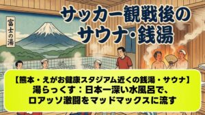 ととのいキャッチコピー:スタジアムのライトアップを眺めながら入る露天風呂の至福 スタジアムからの距離:徒歩約15分、車で約5分 サポーターへの推奨度:ガンバサポなら一度は行くべき「渋滞回避の聖地」