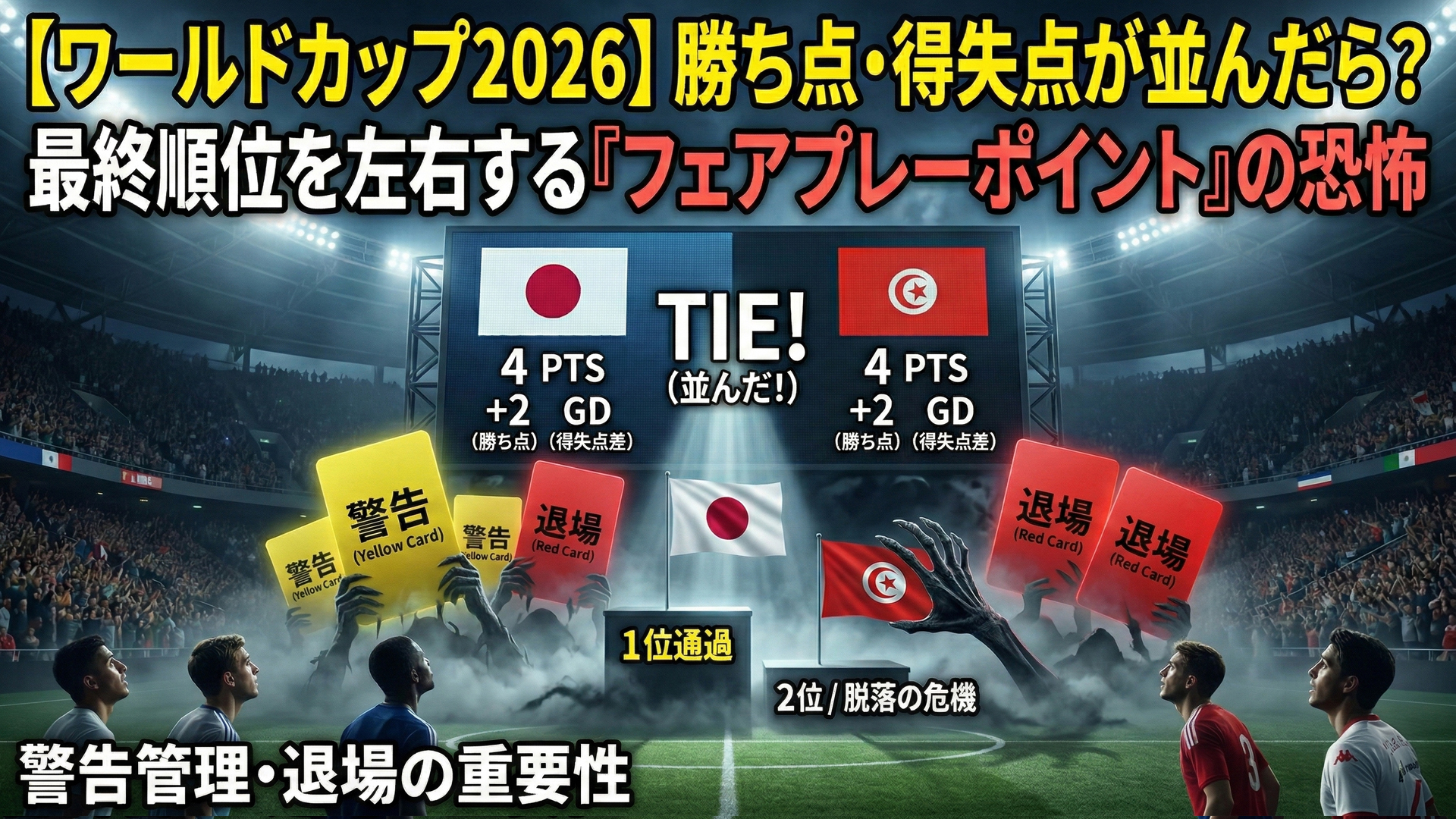 この「3位チーム同士の比較」が曲者です。異なるグループのチーム同士は直接対決がないため、上記の優先順位の3〜5(直接対決の結果)が適用できません。つまり、勝ち点、得失点差、総得点が並んだ場合、一気に「フェアプレーポイント」での比較へと飛ぶことになります。 2026年大会のグループステージ最終日は、異なるグループの試合結果や「カードの枚数」を常に計算しながら観戦するという、非常に複雑でスリリングな状況になることが予想されます。