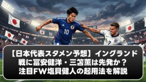 - 後半(45分〜90分):スピードスター投入による攻勢 後半、相手の運動量が落ちてきたタイミングで、三笘薫や前田大然、そして新星・塩貝健人といった「スピードと推進力」のある選手を次々と投入。オープンな展開になればなるほど、日本の走力が活き、主導権を握る時間帯が増えるはずです。