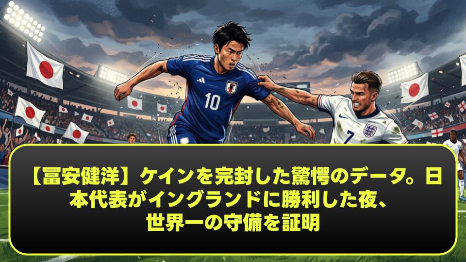 サッカー史上、これほどまでに一人のストライカーが沈黙させられた夜があっただろうか。イングランド代表が誇る史上最高のストライカー、ハリー・ケイン。プレミアリーグとブンデスリーガで得点王に輝き、代表でも歴代最多得点記録を保持する怪物が、日本代表のセンターバック、冨安健洋の前で完全に無力化された。試合後のスタッツシートには、冨安の驚異的なパフォーマンスを裏付ける数字が並び、世界中のスカウトやジャーナリストたちが「世界一の守備」と称賛を惜しまなかった。本記事では、冨安がいかにしてケインを封じ込め、歴史的勝利の立役者となったのか、そのスタッツとプレー内容を徹底的に深掘りする。