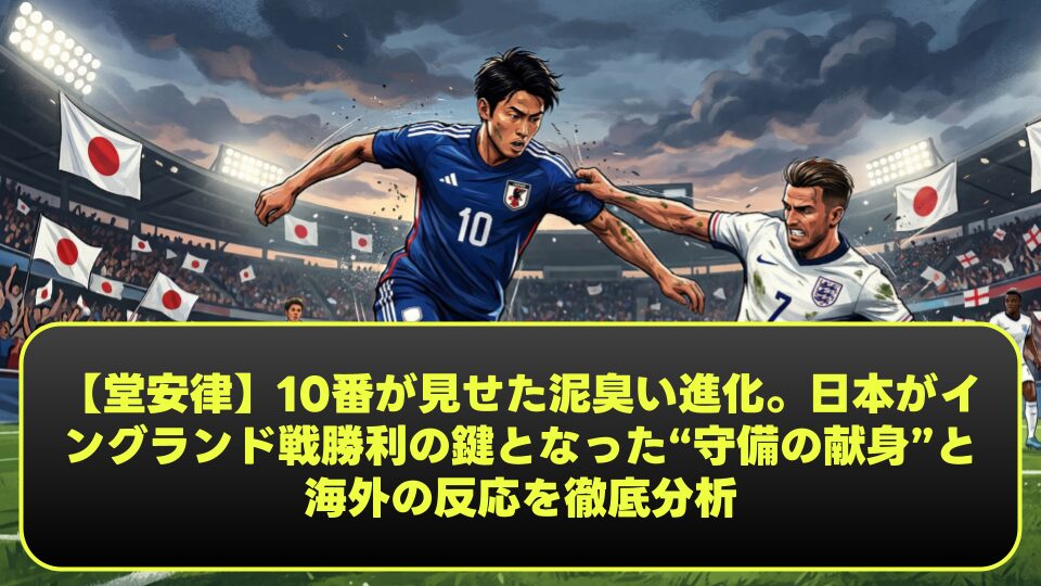 サッカー日本代表がイングランドを沈めた劇的な夜。輝かしい攻撃陣の突破力や、最終ラインの強固な守備がスポットライトを浴びる中、玄人や海外の戦術アナリストたちから熱狂的な賛辞を送られた選手がいる。背番号「10」を背負う堂安律だ。かつては華麗なドリブルや強烈なシュートといった「個の打開力」で魅了してきた生粋のアタッカーは、この歴史的一戦において、泥にまみれ、誰よりも走り続ける「献身的なチームプレーヤー」としての真髄を見せつけた。本記事では、日本勝利の隠れた鍵となった堂安の守備における献身性と、その進化した姿に対する海外の反応を徹底的に分析する。