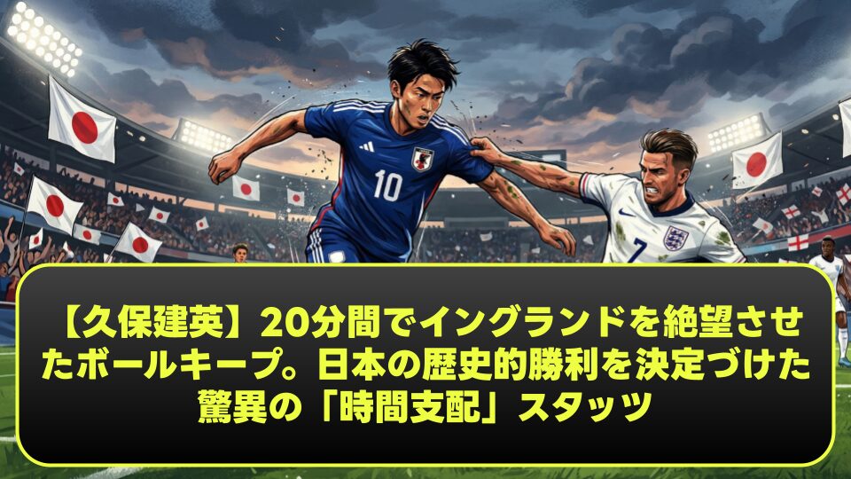 サッカーの試合において、終盤の数分間は「永遠」のように長く感じられることがある。特に、1-0という最小得点差でリードし、相手がサッカーの母国イングランドであり、猛烈な反撃に晒されている状況であればなおさらだ。そんな極限のプレッシャーの中、後半途中からピッチに送り出された久保建英は、わずか20分間という短い出場時間で、イングランドの希望を完全に打ち砕いた。彼が託されたミッションは、追加点を奪うことではなく「時計の針を進めること」であった。本記事では、久保建英がいかにして圧倒的なボールキープで時間を支配し、日本の歴史的勝利を決定づけたのかを、驚異のスタッツとともに紐解いていく。